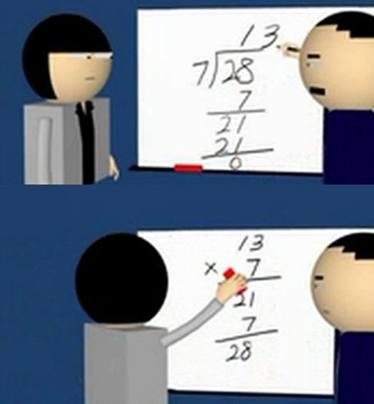 이에 사장은 “7x4 = 28이지 어떻게 7x13 = 28이냐”며 “초등학교는 나왔느냐”고 한다. 그러나 이 사원은 7x13 = 28을 칠판에 증명해 보인다.