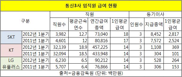 올 1분기 수익성이 크게 둔화된 통신3사(SKT, KT, LG유플러스)가 등기이사의 급여를 크게 올렸다.