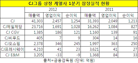 1일 금융감독원 공시자료에 따르면 올 1분기 CJ그룹 상장 계열사 전체 매출은 7조6천602억원으로 전년 동기 5조6천105억원보다 36.5% 늘었다. 전체 영업이익은 4천692억원으로 24.4% 증가했다.
