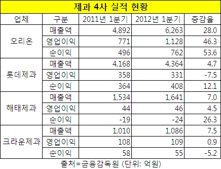 올 1분기 제과4사 중 오리온의 실적이 나홀로 급상승하며 롯데제과, 크라운-해태제과의 부러운 시선을 받았다.