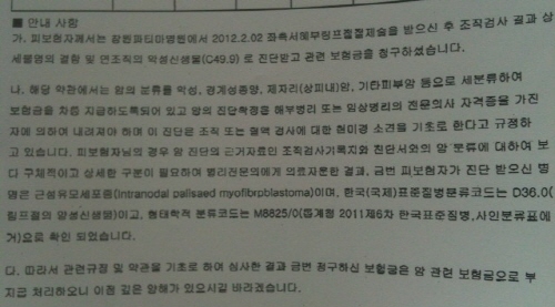 보험사 측이 심사과정에서 최 씨의 진단결과에 대해 암 진단의 근거자료인 조직검사기록지와 진단서와의 암 분류에 대해 보다 구체적이고 상세한 구분이 필요하다는 판단아래 병리전문의에게 의료자문을 요청한 결과 ‘병명 근섬유모세포종, 림프절의 양성신생물(D36.0)’이라는 진단이 나왔다는 것.