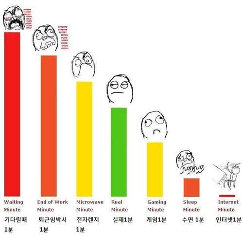 해당 게시물은 각기 다른 상황에서 체감하는 1분을 그림과 함께 나타낸 것이다. 기다릴때와 퇴근이 임박했을 때의 1분은 실제 1분보다 길게 느껴지는 반면 인터넷이나 게임을 하거나 잠을 잘 때의 1분은 짧게 느껴진다.