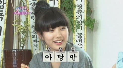 6월2일 방송된 KBS 2TV ‘청춘불패2’에서 수지는 멤버들에게 “아당만이 뭘까요”라며 줄임말 퀴즈를 냈다.