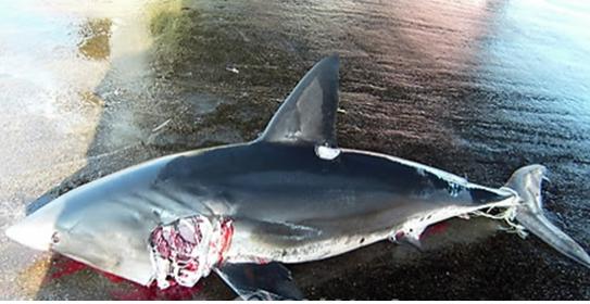 죽은 식인상어를 발견한 것은 조업중이던 어민으로 이 식인상어는 그물에 걸려 이미 죽은 상태였다.