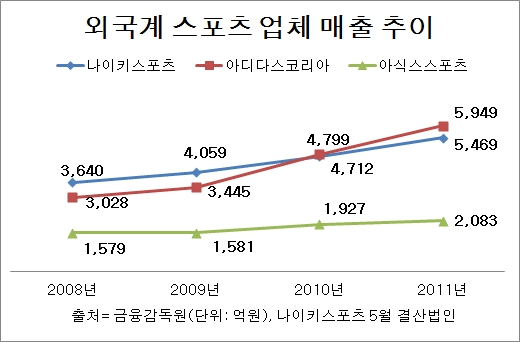 나이키의 한국법인인 나이키스포츠(5월 결산법인)는 3년 사이 50% 넘는 폭발적인 성장률을 기록하고 있다. 지난해 매출액은 5천469억원으로 2008년 3천640억원에 비해 50.2% 증가했다. 또 영업익(780억원)과 순익(595억원)도 각각 전년비 53.8%, 56.2% 증가했다.