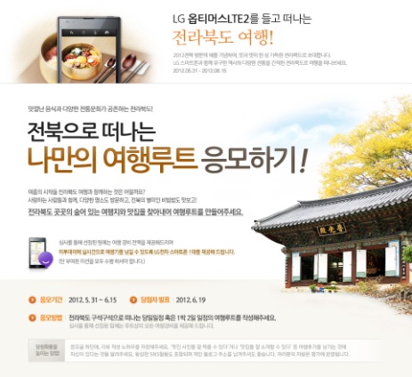 LG전자(대표 구본준)가 윙버스와 손잡고 ‘LG 옵티머스 LTE2를 들고 떠나는 전라북도 여행’ 이벤트를 진행한다.