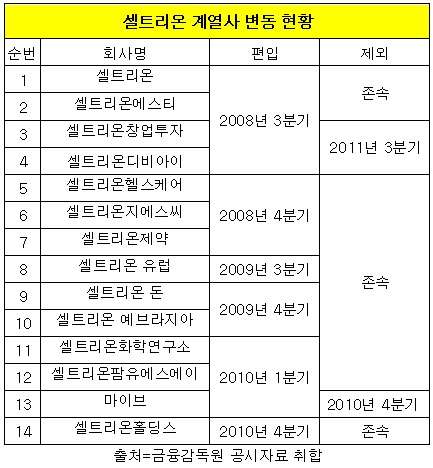 우선 2008년 말 서 회장이 대주주로 있는 넥솔(96.66%)과 넥솔바이오텍(61.34%)이 자회사로 추가됐다. 넥솔과 넥솔바이오텍은 이듬해 각각 셀트리온헬스케어와 셀트리온지에스씨로 사명을 바꿨다.