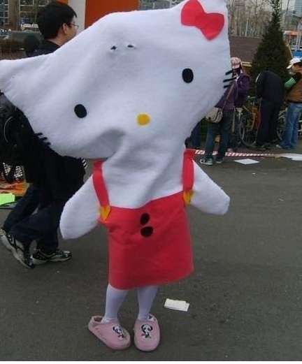사진은 ‘키티’ 탈을 쓰고 있는 사람의 모습을 담고 있다. 그러나 사진 속 키티는 늘 접하던 키티의 귀여운 모습과는 다소 거리가 있다.
