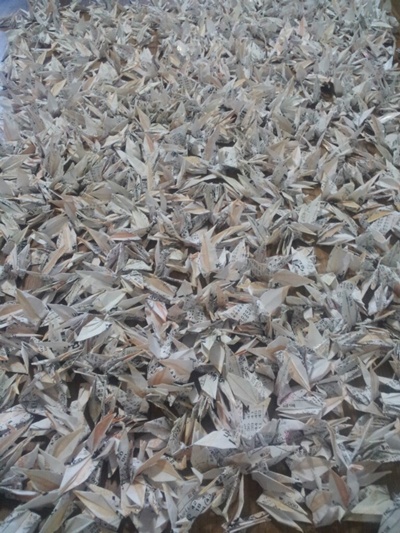 사진에는 복권으로 만들어진 여러개의 종이학이 담겼다. 한 복권 중독자가 당첨이 되지 않은 복권으로 종이학을 접은 것.
