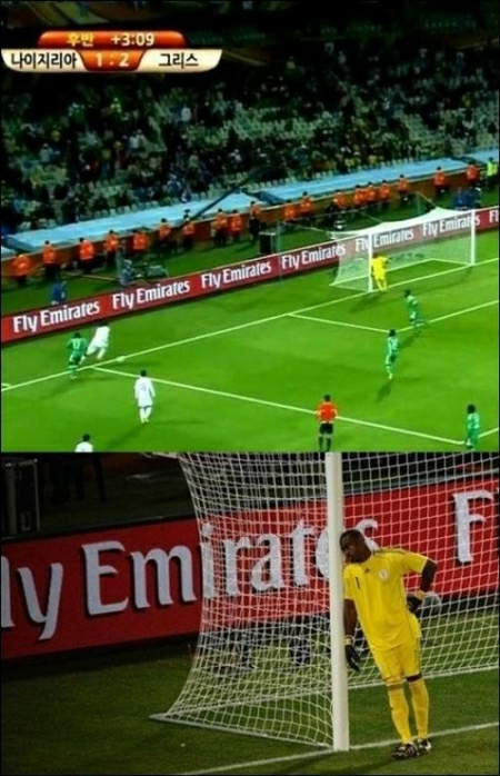 공개된 '축구가 지겨운 골키퍼' 게시물은 나이지리아와 그리스의 축구경기 모습이다.