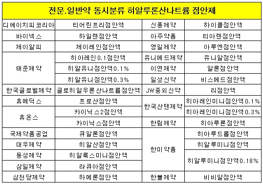 이 외에도 디에이치피코리아, 바이넥스, 제이알피, 한국글로벌제약, 휴메딕스, 휴온스, 국제약품공업, 대우제약, 동성제약, 삼일제약, 삼천당제약, 아주약품, 영일제약, 유니메드제약, 이연제약, 일성신약, JW중외신약, 한국산텍제약, 한림제약, 한불제약 등도 히알루론산나트륨 점안제가 전문약과 일반약으로 동시에 분류된다. 현행 약사법에 따르면 전문의약품은 의사처방전이 있어야 약국에서 구입할 수 있다. 일반의약품은 그냥 약국에서 구입할 수도 있고, 필요에 따라 의사들의 처방에 의해 판매되고 있다.