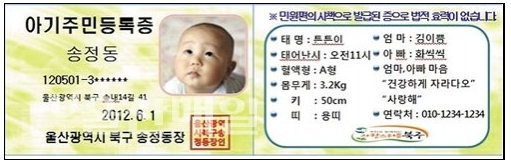 이는 저 출산 시대 자녀의 탄생을 축하하기 위해 울산시 북구는 처음으로 아기 주민등록증을 발급하기로 한 것이여서 더욱 큰 관심을 모으고 있다.