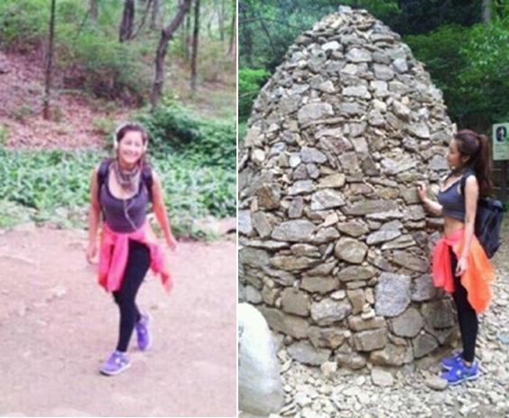 또 다른 사진에서 솔비는 탄탄한 복근을 뽐내며 돌탑 옆에 서 있다.