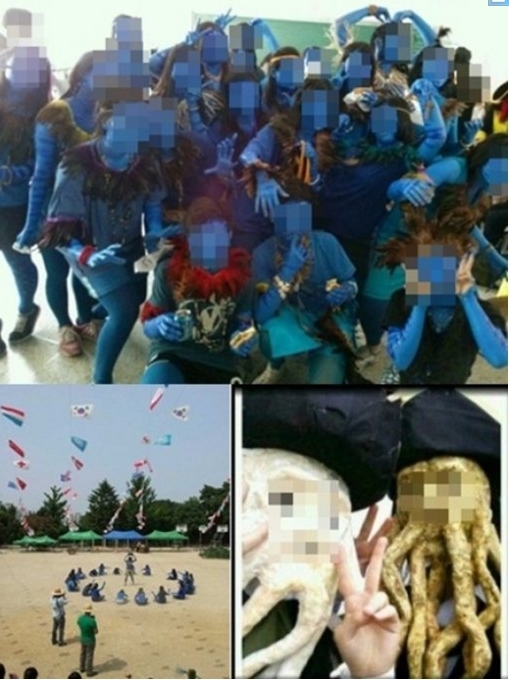 사진을 살펴보면 한 반 학생들이 모두 'ㅋ'이라고 적혀 있는 티셔츠를 입고 뒤돌아 앉아있으며 다른 사진에서는 영화 ‘캐리비안의 해적’에서 나오는 캐릭터 가면을 쓰고 있다.