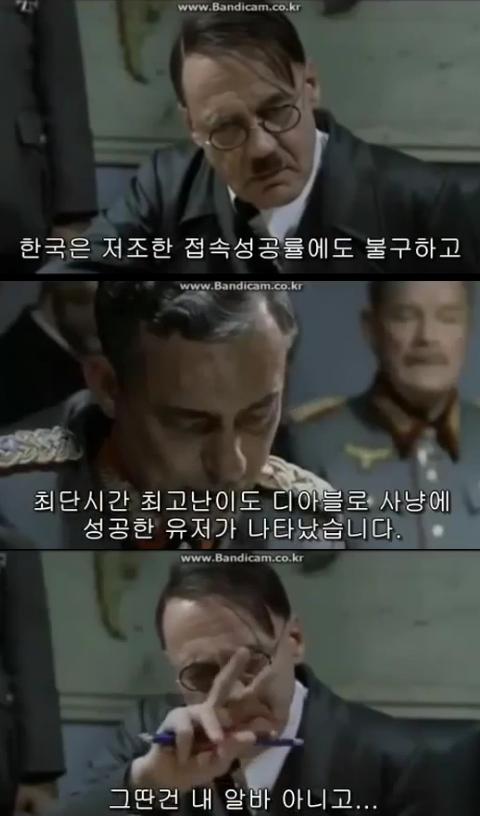 히틀러가 “지금 접속된다고 안된다고?”라고 장교에게 묻고, 장교는 “유저님 워낙 디아블로3이 인기가 많아서 어쩔 수 없는...”이라고 답한다. 다음 히틀러의 대사가 압권이다.