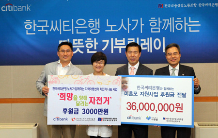 씨티은행은 11일 오전 서울 중구 다동 본점에서 열린 전달식에서 하영구 은행장과 진창근 노조위원장이 김기일 함께하는사랑밭 회장과 이경림 부스러기사랑나눔 대표에게 기금을 전달했다.