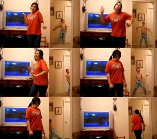 이 여성의 뒤에는 남동생인 듯한 아이가 뒤에서 장난을 하며 춤을 따라하고 있다.