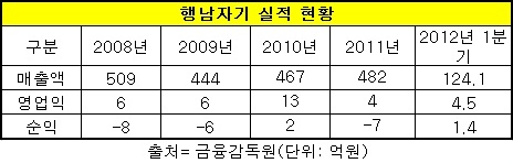 행남자기는 2008년 509억원이었던 매출이 2009년 444억으로 급감한 뒤 지난해까지 500억원을 밑돌고 있으며 순이익도 2008년(8억) 2009년(6억) 2011년(7억)에 마이너스를 기록했다.