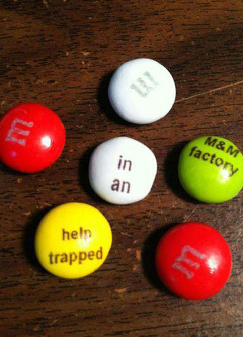 '섬뜩한 초콜릿' 사진 속 색색의 초콜릿 알맹이에는 알파벳이 새겨져 있는데 이를 조합해보면 'help trapped in an M&M factory(도와주세요. M&M 공장에 갇혀있어요)'라는 문장이 완성돼 섬뜩함을 준다.