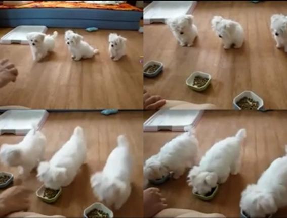 공개된 영상에는 작은 강아지 세 마리가 사료 그릇 앞에 나란히 앉아있다.