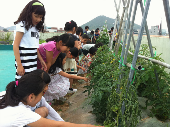 12일 광주 서구 풍암동 운리초등학교(교장 최형주) 후관 옥상에 조성된 110㎡ 넓이의 텃밭(하늘 농장)에 교장을 비롯한 교직원과 학생들이 손수 기른 유기농 야채들이 하나둘씩 결실을 맺어가고 있다.