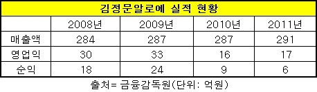 영억이익도 2007년 35억원으로 정점을 찍은 뒤 지난해 17억원으로 반토막이 났다. 순이익 또한 지난해 6억원으로 지난 2008년의 3분의 1수준으로 떨어졌다.