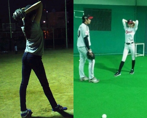 사진 속 그녀는 없는 시간을 쪼개 근처 중학교에 가 야구부에 시구 특훈을 받는 등 열의를 다하고 있다.