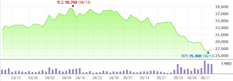 하지만 3만원대를 유지하던 주가가 이번 달 들어서 하락세로 전환된 후 2만5천원까지 추락하며 하락 속도가 가파르게 나타났다.