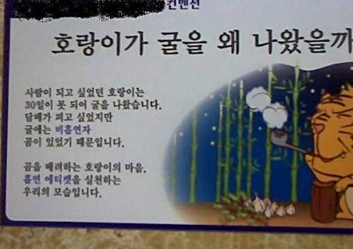 단군신화를 패러디한 공익 광고물이었던 것. 우리가 알던 단군신화 속 참을성 없는 호랑이와 달리 이 안내문에서는 '곰이 비흡연자'라서 에티켓을 지키기 위해 30일 만에 굴을 탈출, 굴 밖 흡연장소에서 담배를 펴 곰을 배려하는 마음을 강조해 반전 매력이 숨어있다.