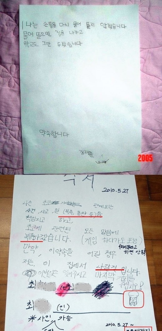 또 다른 '딸의 심오한 각서'는 2010년 5월 27일 날짜가 적힌 각서로 "나는 초코가 관계되는 사건, 사고, 일(목욕, 똥판 등)을 책임지고 하고, 초코에 관련된 모든 말씀에 복종하겠습니다(게임 하다가도 포함)"라는 내용이다.
