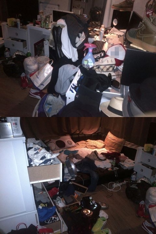 특히 방의 서랍들은 다 열려 있고, 침에 위에도 옷과 온갖 물건들이 널려있어 충격을 더하고 있다.