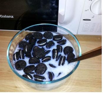 이 최강 느끼한 아침 식사 사진에는 우유에 초코과자를 잔뜩 넣어둔 그릇이 눈에 띈다.