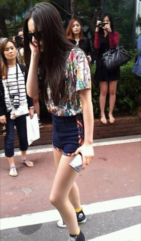 또한, 독특한 프린트의 티셔츠에 가장자리에 성조기 무늬로 포인트를 준 데님 핫팬츠를 입어 발랄한 스타일을 선보인 소희는 노란 양말과 검은 색 스니커즈로 패션을 완성했다.
