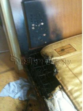 정 씨의 설명에 따르면 그날도 정 씨는 어김없이 매트위에서 잠을 자다 이상한 느낌이 들어 눈을 떴더니 오른쪽 어깨 위쪽 부분 매트가 불길에 휩싸여 활활 타고 있었다.
