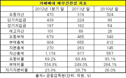 카페베네는 올 1분기 수익성이 악화된 가운데 부채비율이 크게 높아지고 단기차입 규모도 급증하는 등 재무건전성에 빨간 불이 켜졌다. 신규 사업 진출에 따른 무리한 투자가 발목을 잡았다는 분석이다.