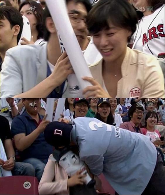 반면 남자 3호는 자신에게 키스타임이 주어지자 화끈하게 일어나 키스를 퍼붙는 장면을 연출해 야구장을 찾은 관람객들을 열광하게 만들었다.