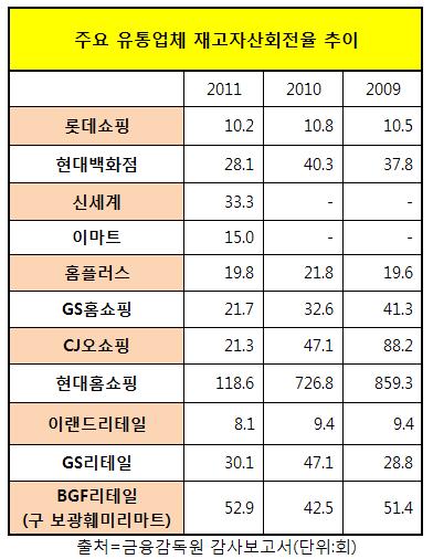 이랜드리테일 다음으로 롯데쇼핑(10.2회), 홈플러스(19.8회) 등도 재고자산회전율이 다소 낮았다.