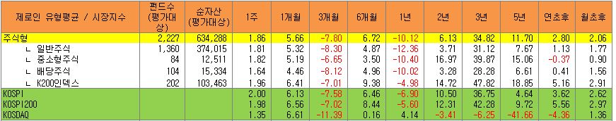 22일 펀드평가사인 제로인에 따르면 국내 주식형펀드(20일 기준)의 한주간 수익률은 1.86%로 같은기간 코스피지수 2.00%를 밑돌았다.