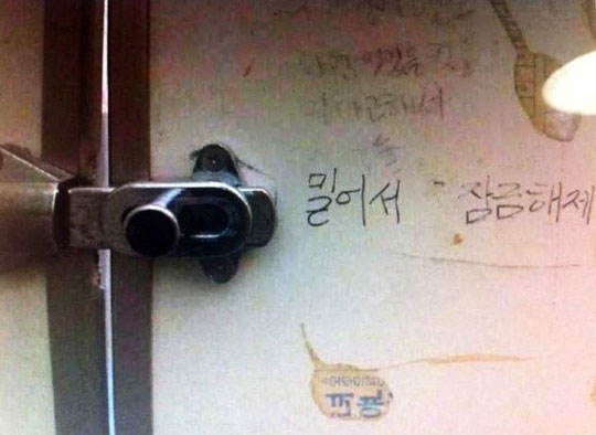 이는 해당 잠금장치 옆에는 '밀어서 잠금해제'란 낙서가 적혀 있어 보는 이들에게 웃음을 안겼다.