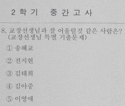 공개된 사진은 한 학교의 2학기 중간고사 문제로, 해당 시험지에는 '교장선생님 과 잘 어울릴 것 같은 사람은?'이라는 문제가 실려있다.