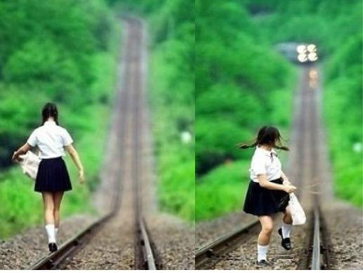 두 번째 사진에는 철로를 걷던 소녀가 기차가 다가오자 헐레벌떡 달아나고 있다.