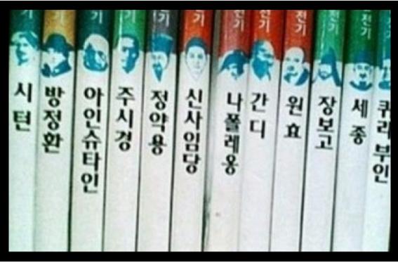 이 센스있는 책 정리 사진에는 책장에 위인전들이 가지런히 정리돼있다.