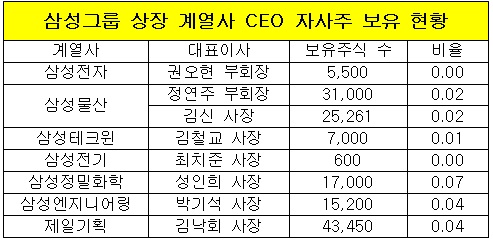 삼성그룹(회장 이건희)은 SK와 마찬가지로 올해 장내 매수에 나선 CEO가 없었다. 13명의 대표이사 중 약 60%에 이르는 8명이 자사주를 보유했다.