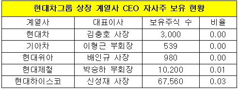 그룹 주력인 현대차와 기아차의 2명 대표 가운데 각각 1명씩만이 지분을 갖고 있다. 현대차는 김충호 사장이 3천주를 기아차는 이형근 부회장이 539주의 소수 지분만을 지녔다. 현대차 윤갑한 부사장과 기아차 이삼웅 사장은 보유 지분이 없다.