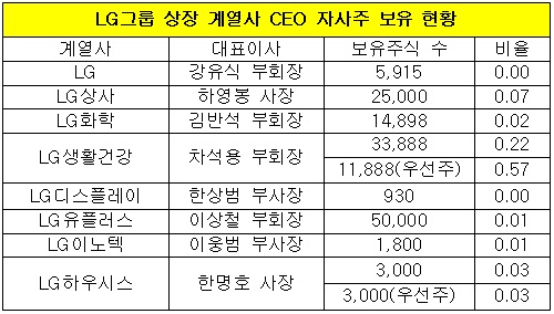 LG 강유식 부회장(5천915주)을 비롯해 LG디스플레이 한상범 부사장(930주) LG유플러스 이상철 부회장(4만주) LG이노텍 이웅범 부사장(1천800주) LG하우시스 한명호 사장(3천주) 등도 0~0.03% 비율로 자사주를 보유했다.