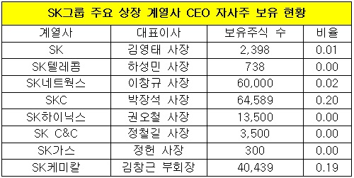 SK 김영태 사장(2천398주)을 비롯해 SK텔레콤 하성민 사장(738주) SK네트웍스 이창규 사장(6만주) SKC 박장석 사장(6만4천589주) SK C&C 정철길 사장(3천500주) SK가스 정헌 사장(300주) SK하이닉스 권오철 사장(1만3천500주) 등 자사주를 갖고 있다.