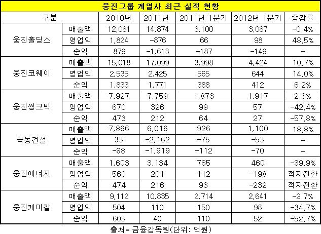 웅진그룹이 지난 1분기중 주력 계열사의 영업이익과 순이익이 크게 줄어들면서 시름에 빠졌다.