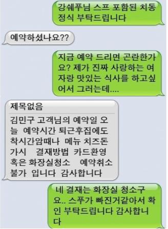 이에 아내는 남편을 고객처럼 대하며 “김민구 고객님의 예약일은 오늘, 예약 시간은 퇴근 후 집에 도착 시간 아무 때나, 메뉴 치즈돈가스, 예약취소 불가. 맥주는 예약시 서비스 제공”이라고 답장했다.
