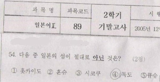 이 게시물은 학 일본어 과목의 시험지로 '다음 중 일본의 섬이 절대로 아닌 것은?'이라는 문제에 보기로 훗카이도, 혼슈, 시코쿠, 큐슈, 독도가 나와있다.