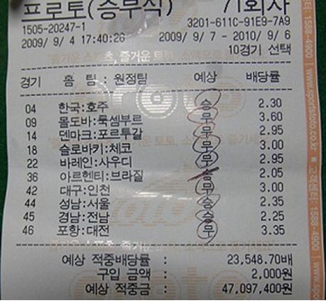 사진을 보면 이 복권을 산 사람은 10경기 중 9경기의 승패를 맞추었고 단 한 경기만을 맞추지 못해 아쉽게 당첨의 기회를 놓쳤다.